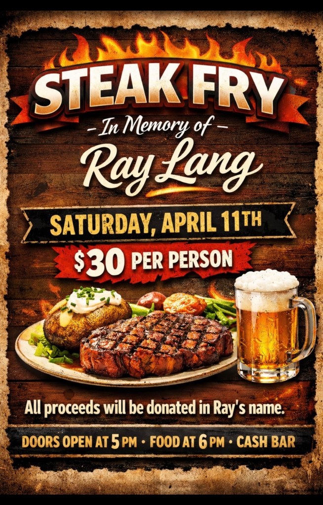 Happening on Saturday, April 11th with doors opening at 5 pm and food served at 6 pm, help us as we honor our friend, the late Ray Lang, with a Steak Fry.